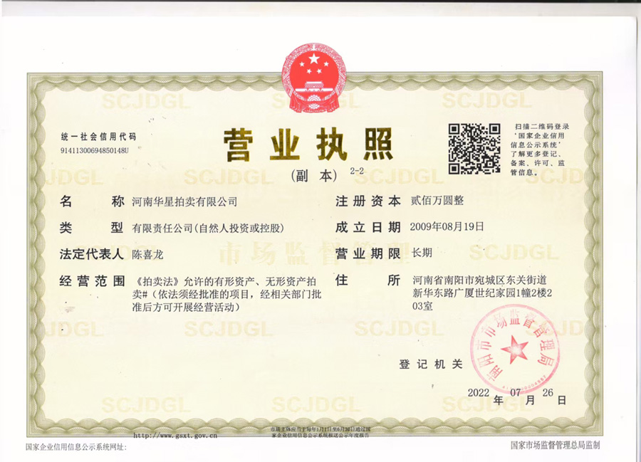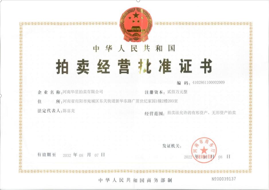 河南華星拍賣有限公司是經(jīng)河南省商務(wù)廳批準(zhǔn),南陽(yáng)市工商行政管理局依法注冊(cè)登記的綜合性拍賣機(jī)構(gòu)。公司成立于2009年8月,注冊(cè)資金100萬(wàn)元人民幣,經(jīng)濟(jì)性質(zhì)為有限責(zé)任公司,2013年7月取得由河南省財(cái)政廳頒發(fā)的“河南省公物拍賣資格證書”,F(xiàn)為河南省拍賣行業(yè)協(xié)會(huì)會(huì)員單位,中國(guó)拍賣行業(yè)協(xié)會(huì)會(huì)員單位,南陽(yáng)市財(cái)政局中標(biāo)單位,唐河縣財(cái)政局中標(biāo)單位。南陽(yáng)市農(nóng)業(yè)銀行中標(biāo)單位,鄧州市機(jī)關(guān)事務(wù)管理局中標(biāo)單位、鎮(zhèn)平縣礦山修復(fù)廢礦產(chǎn)處置拍賣機(jī)構(gòu)(唯一中標(biāo))。 本公司的業(yè)務(wù)范圍為:行政執(zhí)法機(jī)關(guān)依法處理物品,充抵稅款的物品;審判機(jī)關(guān)依法處理的物品,充抵罰金、罰款的物品,無(wú)法返還的追回物品;檢察機(jī)關(guān)依法追回的物品;航運(yùn)、郵政、公路等部門獲得的需處理的物品;金融部門需處理的借款抵押財(cái)產(chǎn),保險(xiǎn)公司理賠后需處理的損余物品;國(guó)家機(jī)關(guān)、事業(yè)單位和國(guó)有企業(yè)按有關(guān)規(guī)定需要處理的財(cái)產(chǎn)及需要變賣的公物;國(guó)家機(jī)關(guān)工作人員在公務(wù)交往和外事活動(dòng)中接受的按規(guī)定需要交公處理的物品;其他方面需要處理的國(guó)有資產(chǎn),如國(guó)有資源、房地產(chǎn)、設(shè)備、攤亭、營(yíng)運(yùn)線路的經(jīng)營(yíng)權(quán),國(guó)有土地、吉利號(hào)碼的使用權(quán),街道、路橋冠名權(quán),新聞媒體和公用設(shè)施廣告的發(fā)布權(quán)等。公司現(xiàn)有國(guó)家注冊(cè)拍賣師4名,會(huì)計(jì)師1名,律師1名,具有拍賣從業(yè)資格的專職人員3名,具有業(yè)務(wù)人員數(shù)名。 本公司嚴(yán)格按照《拍賣法》的規(guī)定程序,規(guī)范運(yùn)作,受到委托單位及競(jìng)買人的充分肯定,為競(jìng)買人及委托單位創(chuàng)造一個(gè)互惠互利、共同發(fā)展的良好平臺(tái),贏得了社會(huì)的廣泛信譽(yù)。
